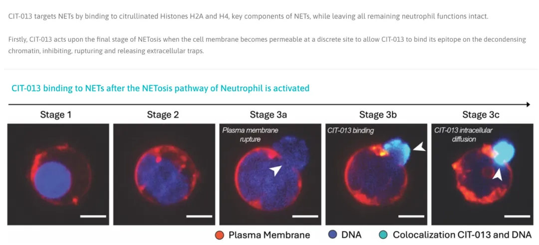 Citryll最近完成了其首个人体1期临床试验,包括成功重复给药类风湿性关节炎(RA)患者。计划在RA和化脓性汗腺炎(HS)中进行2a期试验,旨在建立CIT-013独特的双重作用机制,增强现有NETs的清除并抑制新NETs的形成。CIT-013对其表位具有高度选择性,最大限度地减少了脱靶效应,并且不会进入细胞,保持了正常的细胞内功能。虽然最初专注于RA和HS,但Citryll的NET靶向方法在广泛的免疫介导的炎症性疾病中具有潜在的应用。