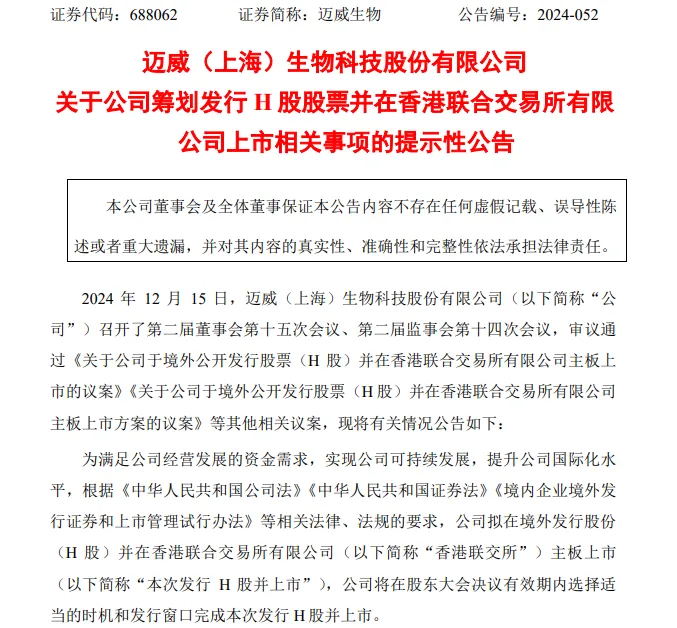 今日(12月16日),创新药企迈威生物动作频频。首先公司披露了关于公司筹划发行H股股票并在香港联合交易所有限公司上市相关事项的提示性公告。