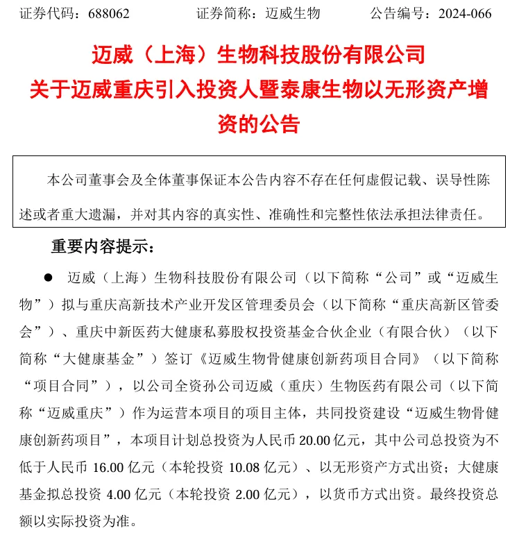 当晚另一份公告显示,迈威生物拟与重庆高新区管委会、大健康基金签订项目投资合作协议,共同投资建设迈威生物骨健康创新药项目,计划总投资20亿元。该项目依托西部(重庆)科学城生物药 CDMO 先进制造基地,使用约 3500 平方米厂房/楼宇,以骨健康领域为核心。