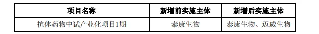 为进一步提高募集资金使用效率、加快募投项目实施进度,公司决定增加迈威生物为“抗体药物中试产业化项目1期”的项目实施主体之一。除新增部分募投项目实施主体外,公司募投项目的投资总额、募集资金投入额、建设内容等均不存在变化。本次新增实施主体具体情况如下:
