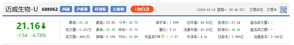 迈威生物是一家以创新型药物和生物类似药研发、生产以及销售为主营业务的药企,公司主要产品为抗体、ADC药物和重组蛋白等。2022年,公司正式在上海证券交易所科创板上市。目前迈威生物总市值为84.56亿元。