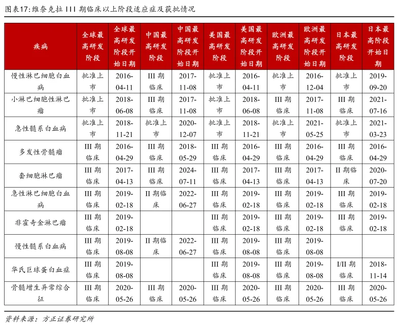 目前,维克奈拉还有拓展广泛的适应症,包括弥漫大B细胞淋巴瘤(DLBCL)、惰性非霍奇金淋巴瘤(NHL)、多发性骨髓瘤(MM)、骨髓增生异常综合征(MDS)、乳腺癌、前列腺癌等。基于此,艾伯维预计维克奈拉峰值销售有望在2026年达到60亿美元。