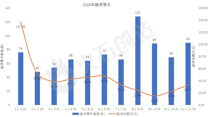 根据火石创造产业数据中心,11月全国生物医药领域(不算拟收购、被收购、定增、挂牌上市)共发生了90起投融资事件,累计金额超过32.77亿元(不含未披露金额项目),和上月融资情况相比,获投项目数量上升了21%,融资金额上升了10.14%。