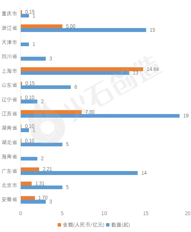 本月融资项目主要分布在江苏省(19起)和浙江省(15起)。从融资金额来看,上海市最为突出,融资金额高达14.64亿元,占总融资金额的44.69%;其次,江苏省也较为突出,融资金额达7.30亿元,占总融资金额的22.28%。
