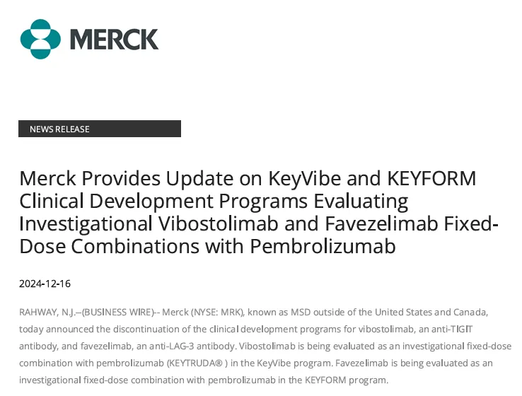 12月16日,默沙东(MRK.US)发布公告,宣布终止开发抗TIGIT抗体Vibostolimab和抗LAG-3抗体Favezelimab。这两个项目旨在探索两种免疫肿瘤药物的组合,以期在多种癌症类型中提高患者的生存率。两个项目的终止也标志着公司在这些特定癌症治疗研究领域努力的结束。
