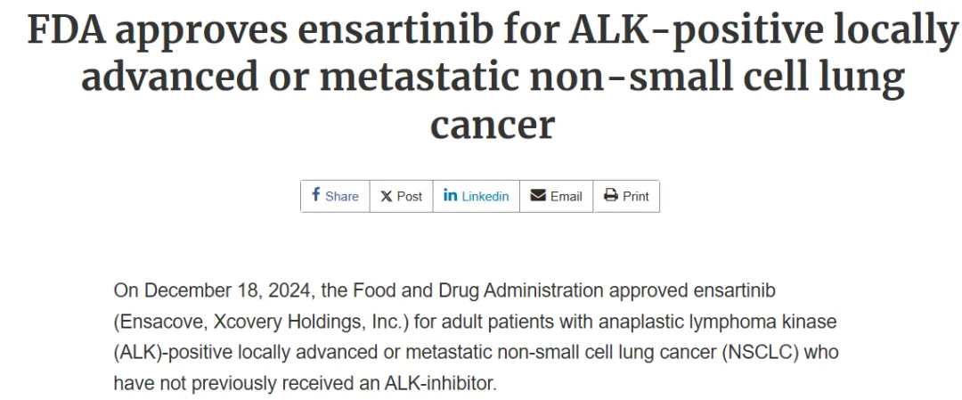 当地时间 12 月 18 日,FDA 宣布已批准贝达药业及其控股子公司 Xcovery 共同研发的间变性淋巴瘤激酶(ALK)抑制剂盐酸恩沙替尼上市,用于 ALK 阳性局部晚期或转移性非小细胞肺癌(NSCLC)患者的一线治疗。这不仅是贝达首个成功出海获批的药物,也是首个获得 FDA 批准治疗这一适应症的国产 1 类新药。