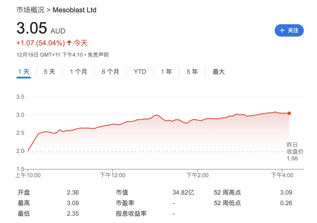 各种标签叠加,令Mesoblast在取得监管突破后,当日股价大涨54.04%,重回四年前水平。