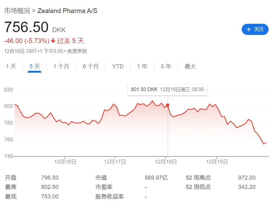 如果按照本来的预期,去年申请上市的Zealand Pharma应该在今年22日迎来FDA的PDUFA日,带着获批成功的喜悦渡过圣诞节。但现在受到该消息影响,19日Zealand Pharma在丹麦根本哈哥证券交易市场截止当日收盘大跌5.73%。