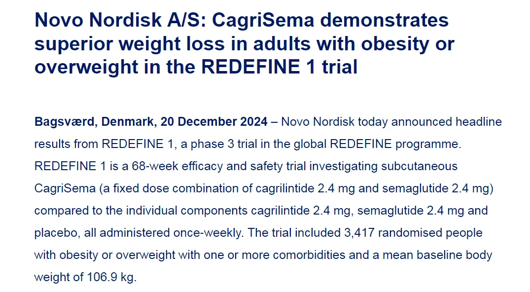 而在近期诺和诺德最新公布的临床3期试验REDEFINE 1的主要结果中,CagriSema的患者在68周后平均减轻了22.7%的体重,低于此前公司25%的预期水平,导致了股价的下跌。