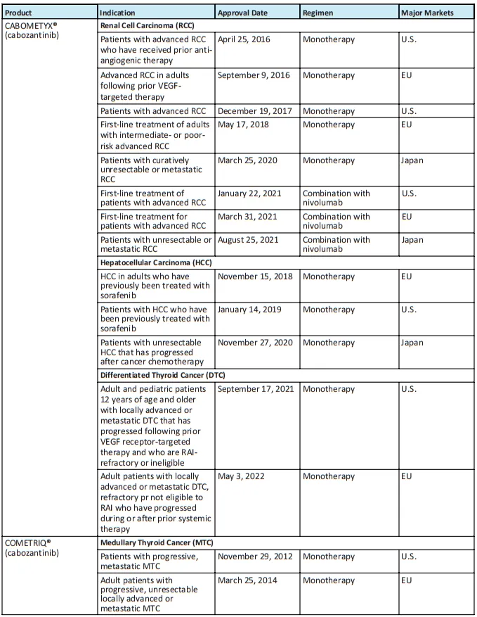 卡博替尼产品组合包括胶囊剂(商品名COMETRIQ®)和片剂(商品名CABOMETYX®),分别针对不同适应症,2021年、2022年和2023年,该系列产品分别为Exelixis贡献了10.773亿美元、14.012亿美元和16.289亿美元的净产品收入,占该公司总收入的绝大部分。在美国以外市场,卡博替尼由合作伙伴益普生IPSEN(美国和日本以外的所有地区)和武田制药(日本)进行商业化销售,2021年、2022年和2023年,分别为Exelixis带来了1.051亿美元、1.214亿美元和1.485亿美元的特许权使用费。