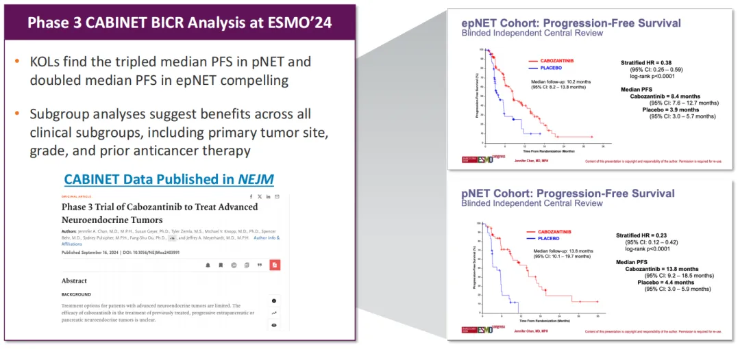 2011年10月,Exelixis与美国国家癌症研究所(NCI)癌症治疗评估计划(CTEP)就卡博替尼的临床开发订立合作研发协议(CRADA)。基于该合作协议开展的关键3期研究CABINET在两个独立队列中评估了卡博替尼(CABOMETYX®)在既往全身治疗后出现进展的神经内分泌肿瘤(NET)患者中的疗效:一个队列针对晚期胰腺神经内分泌肿瘤(pNET);另一个队列针对胰腺外神经内分泌肿瘤(epNET)。由于中期分析中观察到的无进展生存期(PFS)主要终点疗效显著改善,该试验被揭盲并提前停止。2024年8月,Exelixis宣布FDA已接受卡博替尼用于治疗既往接受过治疗的晚期pNET/epNET成年患者的sNDA申请,PDUFA目标日期为2025年4月3日,FDA还授予卡博替尼用于治疗pNET的孤儿药资格认定。2024年11月,该公司宣布FDA将于2025年3月召开ODAC会议讨论该sNDA申请。