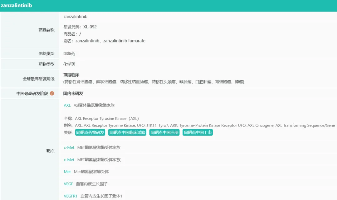 药融圈获悉:卡博替尼(Cabozantinib)是一种非特异性酪氨酸激酶抑制剂(TKI),由美国生物制药公司Exelixis研发,其本质是一种喹啉类化合物,在2012年由美国FDA首次获批上市,因其对RET、AXL、MET和VEGFR等多个靶点具有靶向性,卡博替尼也被称为是抗癌“万金油”。自首次上市以来,卡博替尼已获批治疗多种癌症,包括甲状腺髓样癌(MTC)、肾细胞癌(RCC)、肝细胞癌(HCC)、分化型甲状腺癌(DTC),其与纳武利尤单抗的联合治疗方案获批一线治疗晚期肾细胞癌患者。