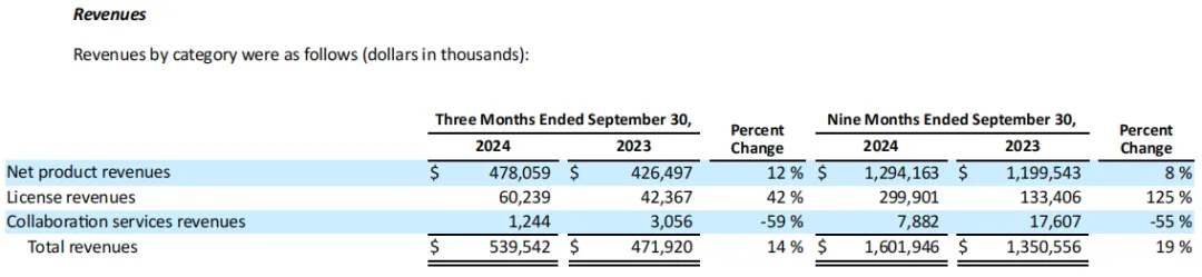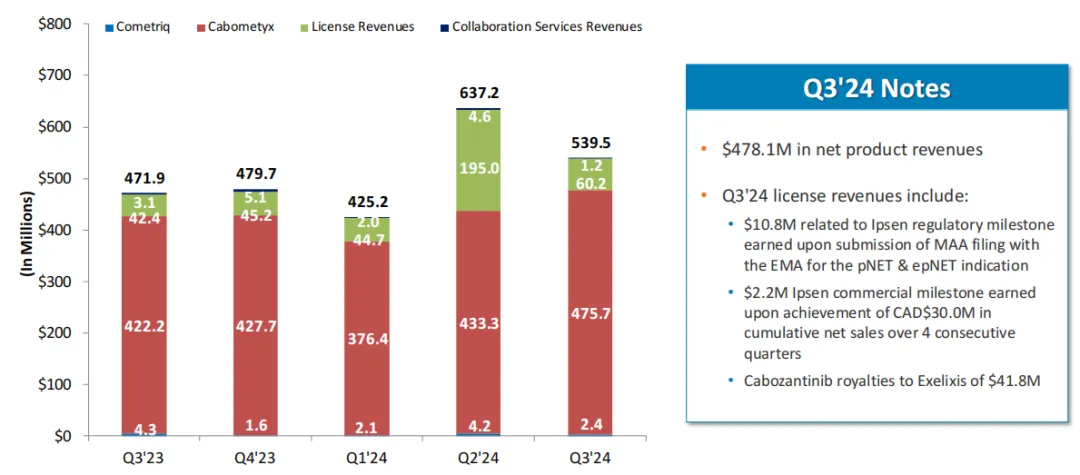 2024年前三季度,Exelixis总收入16.02亿美元(+19%),其中卡博替尼净产品收入12.9亿美元(+8%)、许可收入3亿美元(+125%)、合作服务收入788万美元(-55%)。