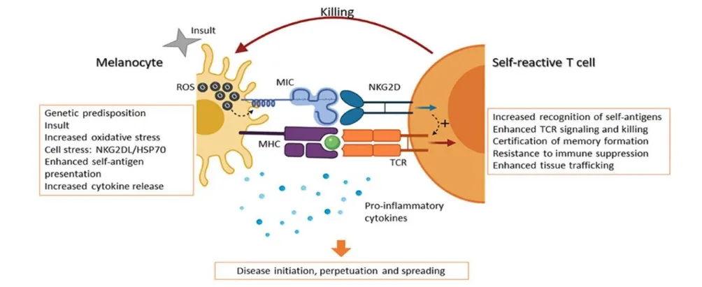 在这些假说中,自身免疫学说是近年来的研究焦点,该学说指出白癜风由机体内 CD8+T 细胞对黑素细胞的杀伤所致。T淋巴细胞,尤其是细胞毒性CD8+T细胞会渗入皮肤的表皮与真皮交界处,持续侵袭健康区域的黑色素细胞,致使脱色区域持续扩大。