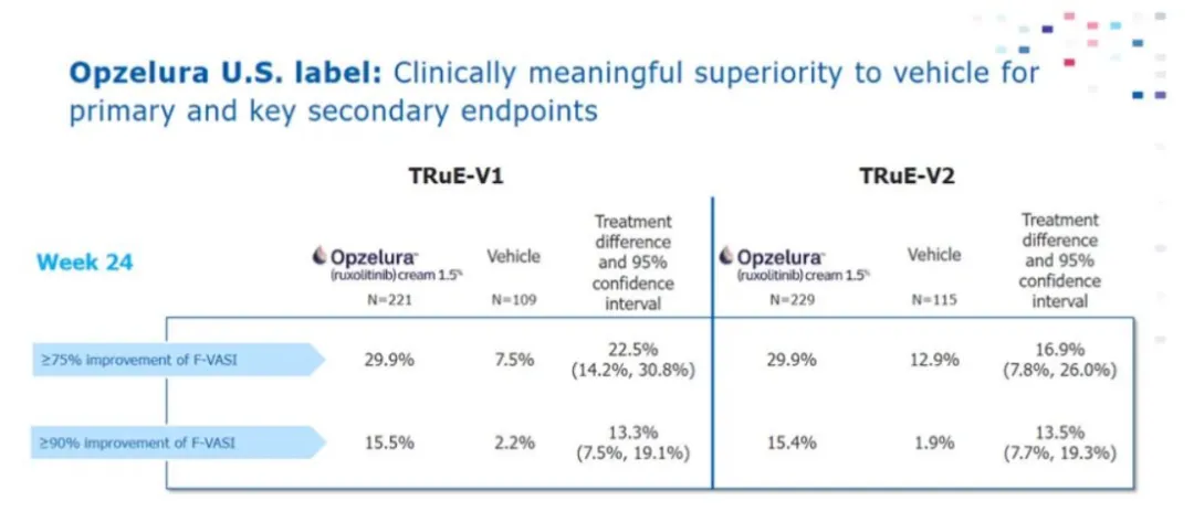 芦可替尼乳膏由Incyte研发,为局部外用JAK抑制剂,于2022年7月获FDA批准上市,用于12岁及以上非节段型白癜风患者的局部治疗。两项关键III期临床试验结果显示,在第24周,芦可替尼组29.9%的患者面部白癜风严重指数相对基线改善≥75%(F-VASI75),而安慰剂组这一比例为7.5%(TRuE-V1)和12.9%(TRuE-V2)。此外,在治疗第52周时,芦可替尼组约50%的患者达到了F-VASI75。