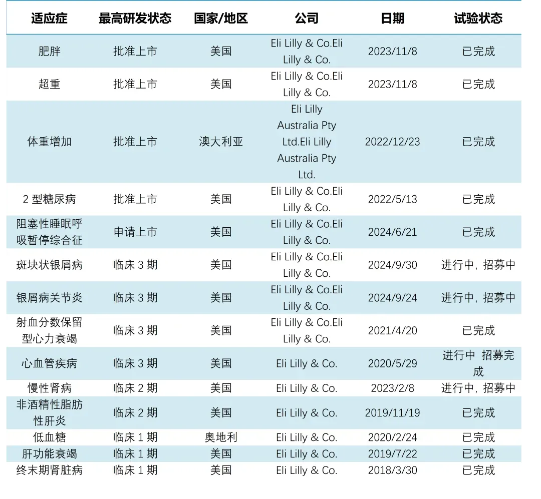 除此之外,替尔泊肽在研适应症还包括斑块状银屑病(PSO)、非酒精性脂肪肝炎(NASH)、慢性肾脏病(CKD)和肥胖患者发病率和死亡率(MMO)等,已经开展临床研究数量超过140个。
