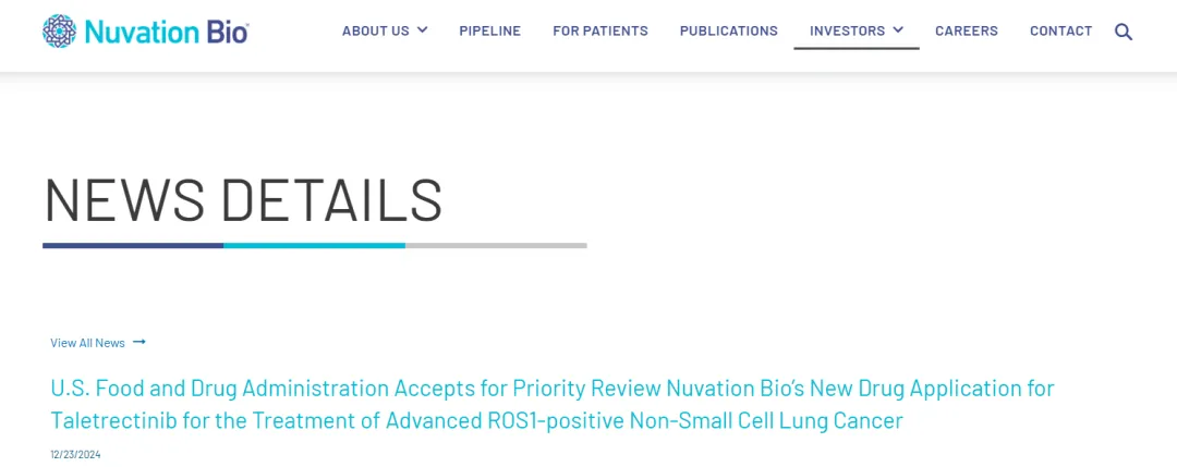 12 月 23 日,Nuvation Bio 宣布美国 FDA 已接受 ROS1 抑制剂他雷替尼的 NDA,并将其纳入优先审评,用于治疗晚期 ROS1 阳性的 NSCLC 成人患者。值得一提的是,此药刚于 12 月 20 日首次被 NMPA 批准上市。