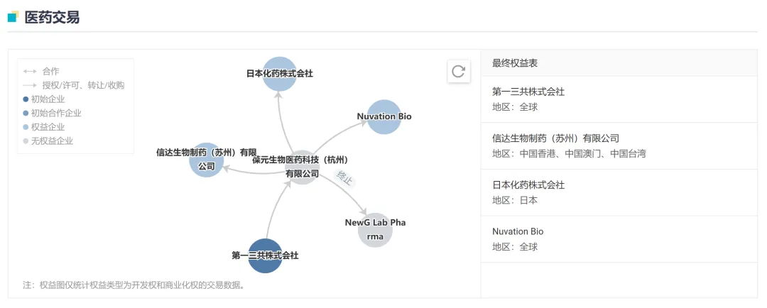 他雷替尼的权益几经周转,获多家药企青睐。该药最初由第一三共研发,原研发代号为 DS-6051。2018 年 12 月,葆元与第一三共达成合作,获得该药全球开发、生产和商业化权益,财务条款当时未予披露;后续于 2021 年 6 月,信达生物又与葆元签订独家许可协议,得以在大中华区(包括中国大陆、香港、澳门和台湾)共同开发和商业化他雷替尼。