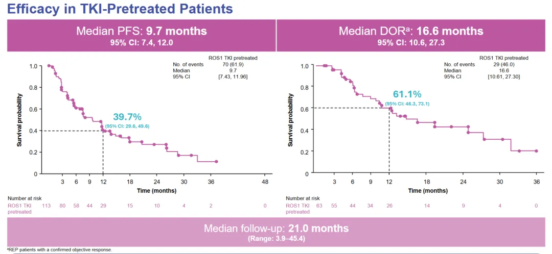 而在 TKI 经治的患者中,cORR 为 55.8%(95%CI: 46.1, 65.1),中位随访 21.0 个月(范围:3.9 - 45.4),mDOR 和 mPFS 分别为 16.6 个月(95%CI: 10.6,27.3)和 9.7 个月(95%CI: 7.4, 12.0)。