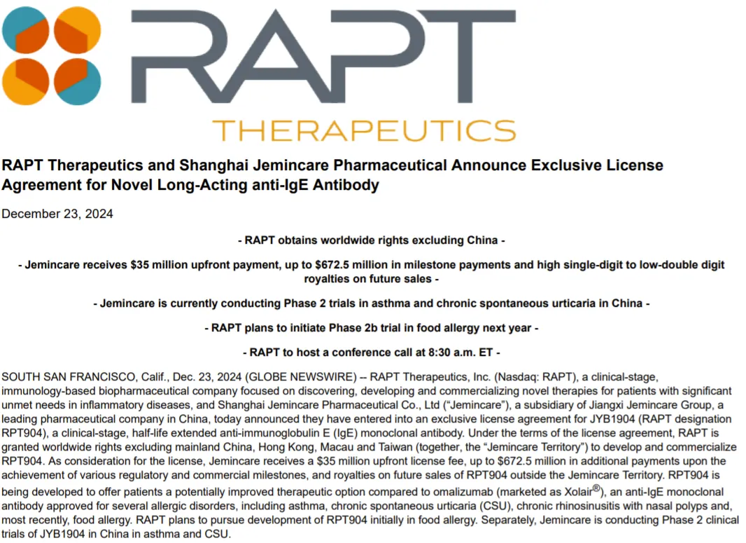 2024年12月23日,RAPT Therapeutics宣布引进济民可信长效IgE抗体JYB1904(RPT904)的大中华区外全球权益,RAPT Therapeutics支付3500万美元预付款,最高6.725亿美元里程碑金额,以及一定比例的销售分成,协议总金额7.075亿美元。JYB1904目前处于中国二期临床研究阶段。