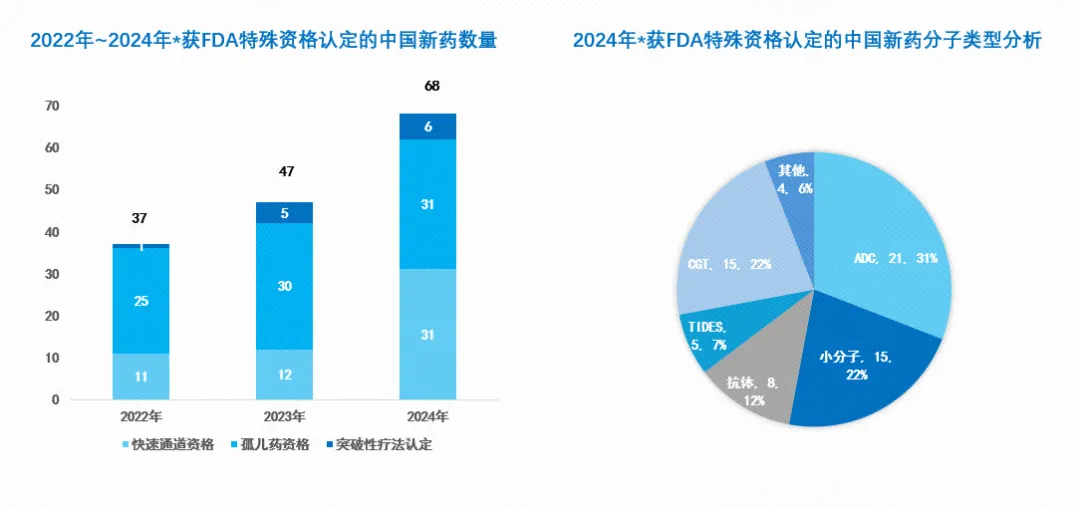 而在特殊资格认证方面,2024年以来,有近70款中国新药获FDA特殊资格认定(仅统计包括快速通道资格、突破性疗法认定以及孤儿药资格),总数量也创近年来新高。2024年,总项目数同比增长45%。其中,获得快速通道资格和孤儿药资格的数量较多,均为31项,突破性疗法认定有6项。