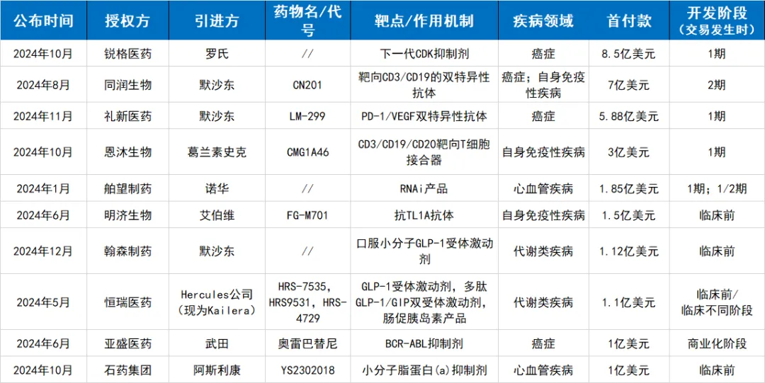 图表:2024年中国创新药国际授权(license-out)首付款1亿美元及以上的合作事件