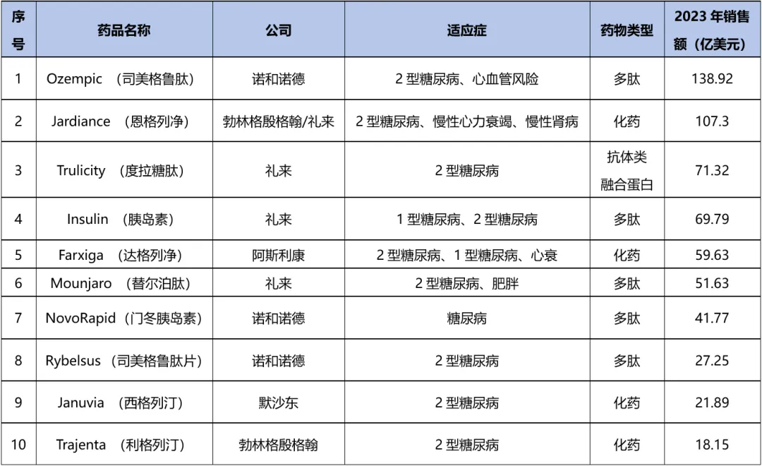 表1. 2024年十大糖尿病药物
