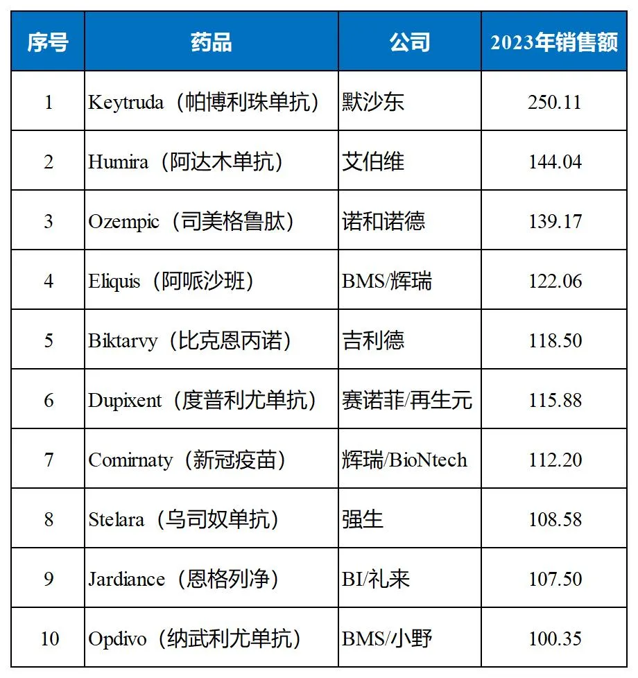 2025年全球畅销药TOP10(亿美元)