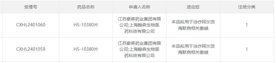 据CDE官网显示,豪森的1类新药HS-10380片获得临床试验默示许可,拟用于治疗阿尔茨海默病相关激越。