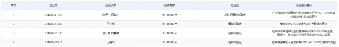 HS-10380片是翰森制药旗下豪森药业开发的一款D2、D3受体和5-HT1A部分受体多靶点激动剂,其对5-HT2A受体具显著拮抗作用,有望改善精神疾病患者的症状。目前,翰森制药正开展HS-10380片的多项临床研究,针对精神分裂症患者。2024年7月,HS-10380片针对双相I型障碍躁狂发作的临床试验申请也获得了CDE批准。此次HS-10380片再获得临床试验批准的适应症为阿尔茨海默病。