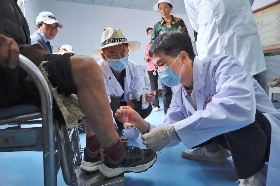 7月12日,在四川省甘孜藏族自治州稻城县吉呷镇东义区中心卫生院内,来自北京市的专家在用火针为村民进行治疗。