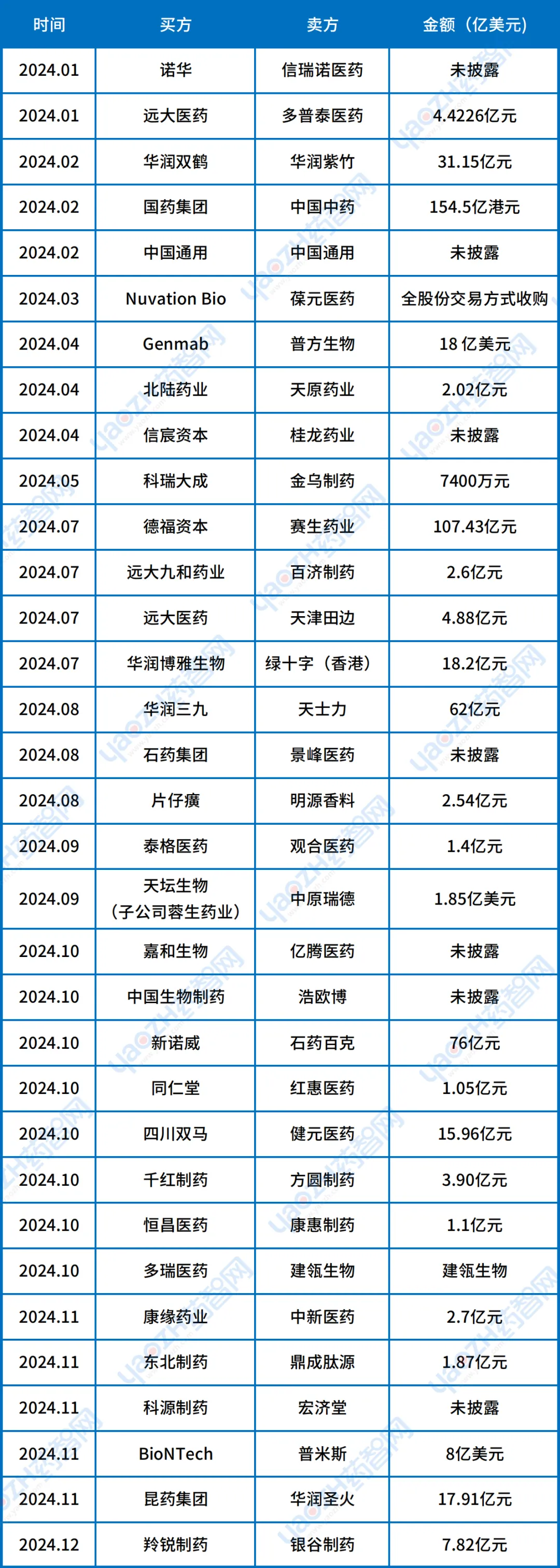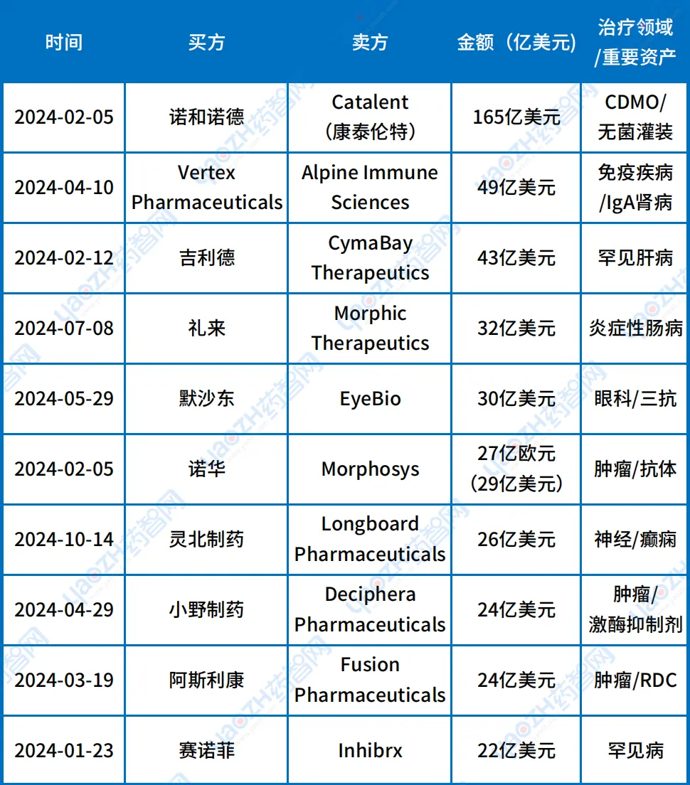 表1 2024年制药行业并购TOP10