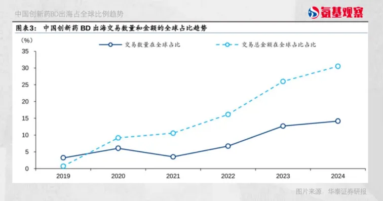 同期,国产创新药对外BD在全球BD中的项目数量占比达14%,总金额占比达30%,中国已成全球创新药重要玩家。
