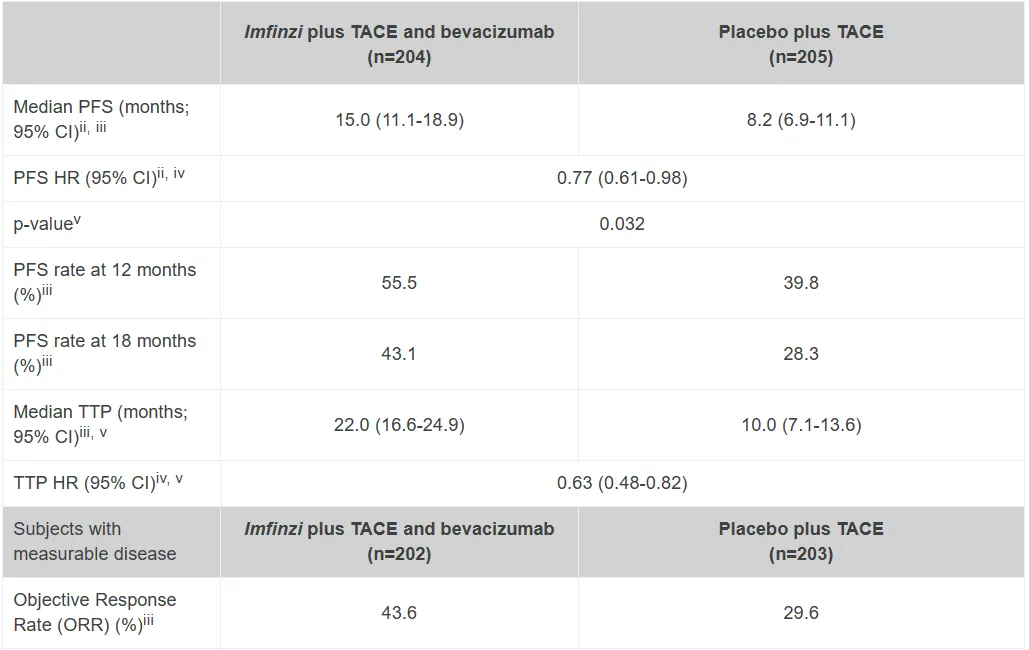 与单独进行TACE相比,度伐利尤单抗联合治疗可使疾病进展或死亡风险降低23%(风险比[HR]:0.77;95%置信区间[CI] 0.61-0.98;p=0.032)。