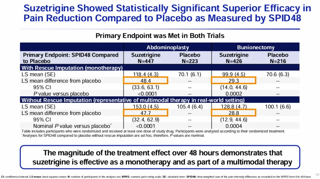 在104和105研究中,相较于安慰剂组,VX-548组患者在主要终点0-48小时疼痛强度时间加权总和(SPID48)方面有统计学意义的改善,表现为VX-548组患者第48小时的数值疼痛评定量表(NPRS)评分相较基线有临床意义的下降。