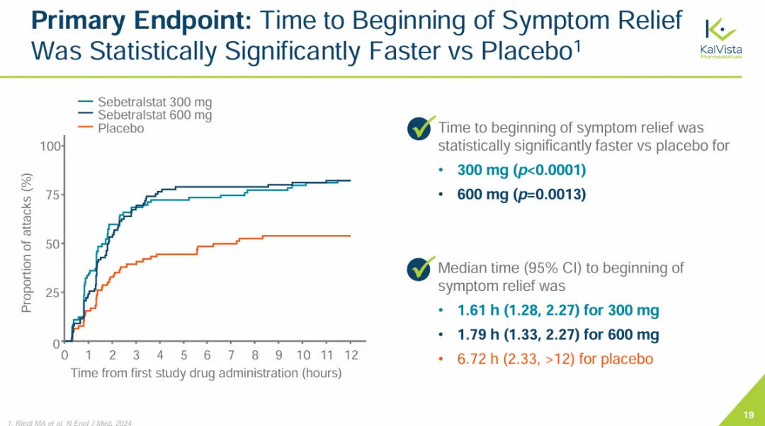 KONFIDENT是迄今为止针对HAE开展的规模最大、最具代表性的试验,试验对象包括青少年、使用长期预防药物的患者以及所有发作严重程度和部位的患者。KONFIDENT试验达到所有主要和关键次要终点。使用300mg和600mg sebetralstat治疗HAE发作,症状开始缓解的主要终点明显快于安慰剂。sebetralstat 300mg组症状缓解开始缓解的中位时间为1.61小时,sebetralstat 600mg组为1.79小时 ,安慰剂组为6.72小时。