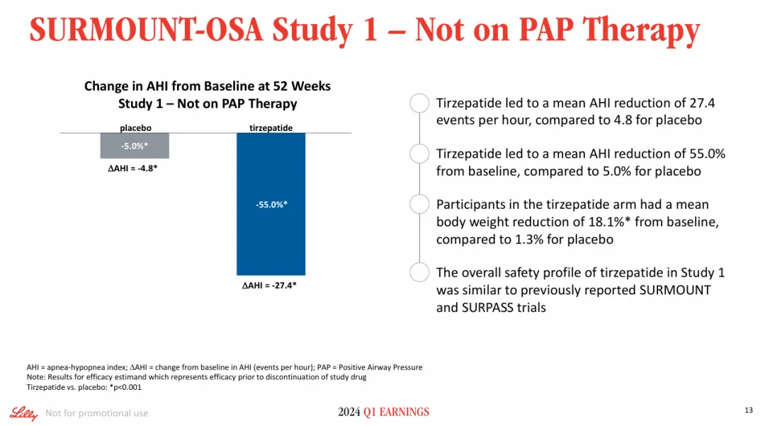 AHI记录了受试者每小时睡眠中呼吸受限或气流完全阻塞的次数,用于评估OSA的严重程度和治疗结果的有效性。SURMOUNT-OSA Study 1评估了替尔泊肽在未接受正压通气(PAP)治疗的中度至重度OSA合并肥胖成人患者中的疗效。结果显示,在52周时,替尔泊肽组受试者平均AHI较基线降低了27.4次/小时,而安慰剂组降低了4.8次/小时。