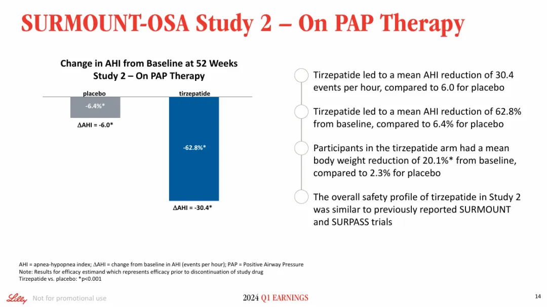 SURMOUNT-OSA Study 2评估了替尔泊肽在接受并计划继续进行PAP治疗的中重度OSA合并肥胖成人中的疗效。结果显示,在52周时,替尔泊肽组受试者平均AHI较基线降低了30.4次/小时,而安慰剂平均降低了6.0次/小时。