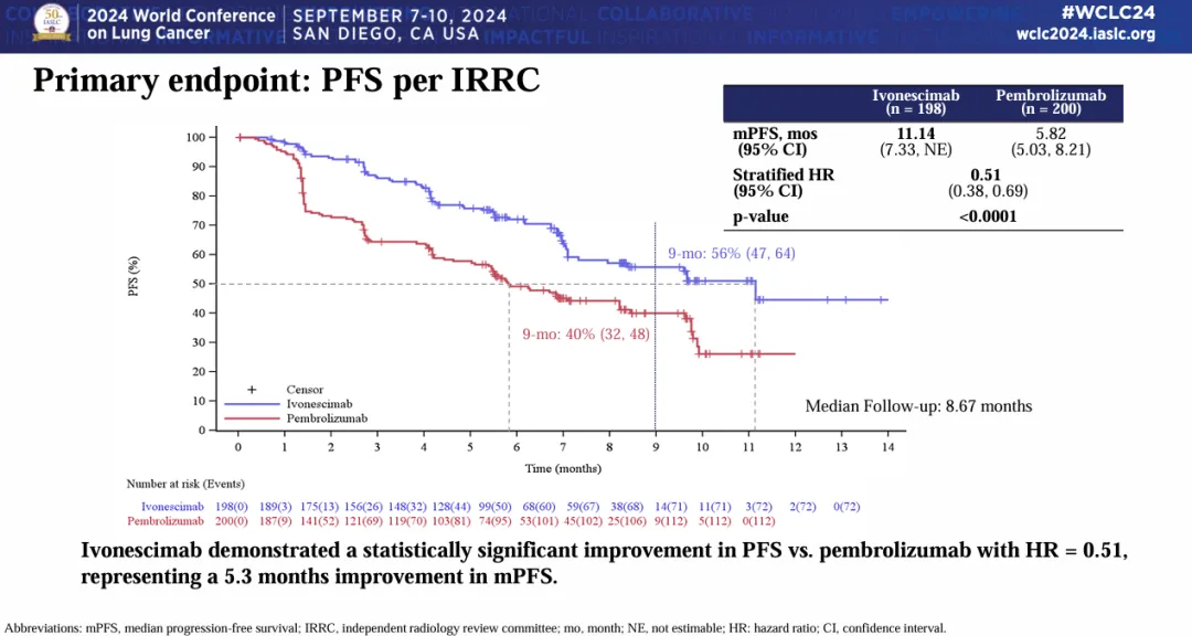 在9月的WCLC大会上,康方生物进一步披露了该研究的数据。在意向治疗人群(ITT)人群中,依沃西组和帕博利珠单抗组的mPFS分别为11.14个月和5.82个月(HR=0.51,P<0.0001),依沃西治疗组疾病进展/死亡风险降低达49%。