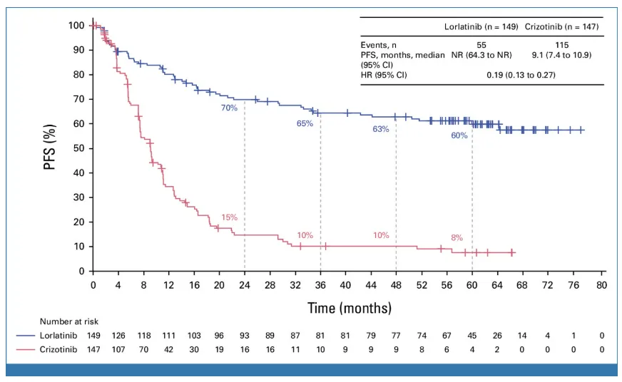 洛拉替尼组的5年PFS率为60%,也就是说,有60%的患者五年后仍未见疾病进展或死亡,而克唑替尼组为8%。“五年后未见疾病进展或死亡”,也意味着这些晚期患者走向了“临床治愈”。