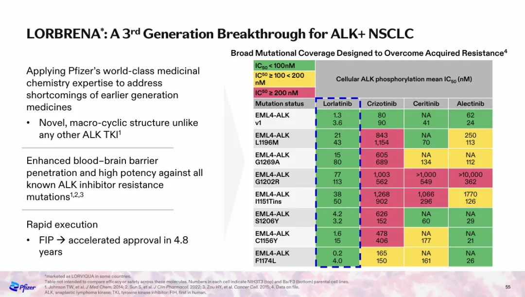 洛拉替尼取得的非凡治疗效果,印证了辉瑞分子设计策略的正确性。辉瑞将洛拉替尼设计成独特的大环结构,带来了更好的亲脂性以及深度的靶点结合,进而增强血脑屏障渗透性并提高对其他ALK抑制剂耐药突变的效力。