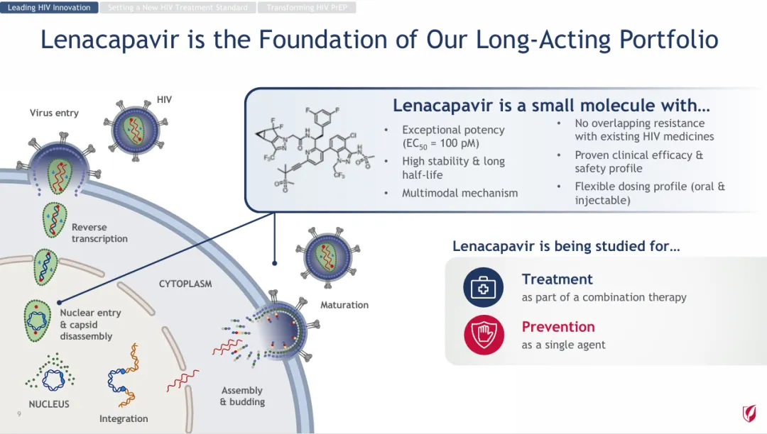 Lenacapavir是一款first-in-class长效HIV衣壳抑制剂,可通过干扰病毒生命周期的多个重要步骤抑制HIV-1的复制,包括抑制由病毒衣壳介导的HIV-1前病毒DNA的摄取、组装和释放,以及病毒衣壳核心的形成,而且对其他现有药物类型没有已知的交叉耐药性。2022年,该药物已获FDA批准上市,用于治疗HIV-1感染。