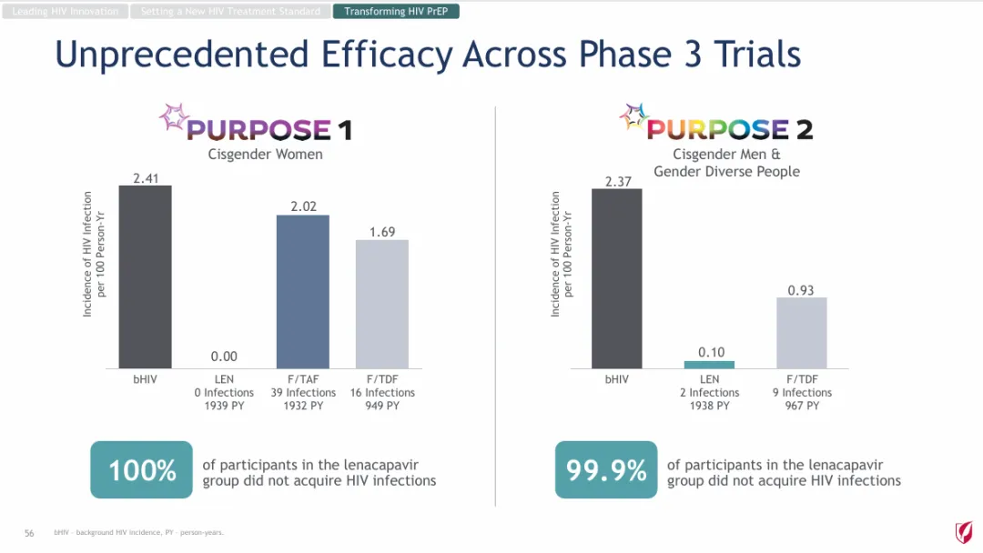 该项目的另一项关键试验PURPOSE 2已于今年9月获得结果,该试验旨在评估lenacapavir在全球男性、变性男性、变性女性等不同性别个体中的PrEP效果。