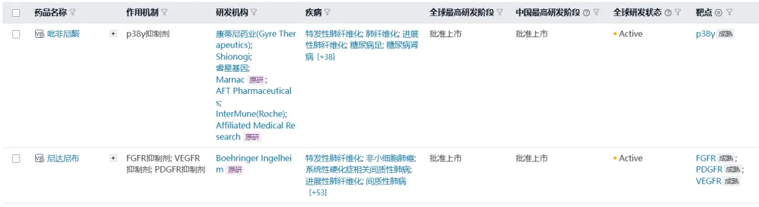 然而,临床上治疗手段却有限。根据医药魔方数据库,全球范围内目前仅吡非尼酮和尼达尼布两款创新药被批准用于治疗IPF,而尼达尼布的开发者正是勃林格殷格翰。