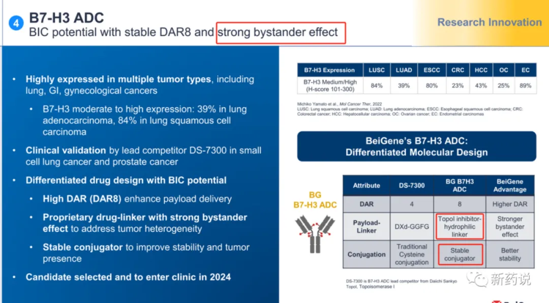 管线方面,如图所示,百济目前的ADC代表管线是BGB-C354,靶向B7H3的ADC,该靶点相信不用多介绍,之前在拆解第一三共的文章《ADC一哥,冲向新金矿》中已经进行了详细阐述,按照百济研发日自己的说法,它将该药与第一三共的DS-7300进行了详细的对比,关于具体的payload和linker先按下不表,它这里的说法是对比DS-7300有了更好的旁观者效应以及linker更好的稳定性(具体的结构,百济卖了个关子,只说是TOPi类型payload以及亲水的linker)。不过相比DS-7300,百济的ADC的DAR值确实做到了很高,DS-7300为4,而百济的ADC达到了8,这里面推测是linker的结构使其拥有了更好靶向肿瘤的精准性,从而提高了安全性,敢于将DAR升高。
