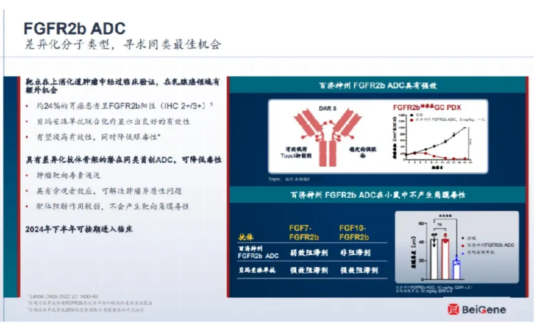 百济的另一条临床I期的ADC管线是BG-C137,该ADC主要的看点是靶点的差异化:FGFR2b,一个目前来看比较冷门的靶点,百济在这个靶点上走在了全球的前列。众所周知,FGFR是通路类型的靶点,在小分子或者单抗来用它抑制通路上此前抑制是个热门方向。