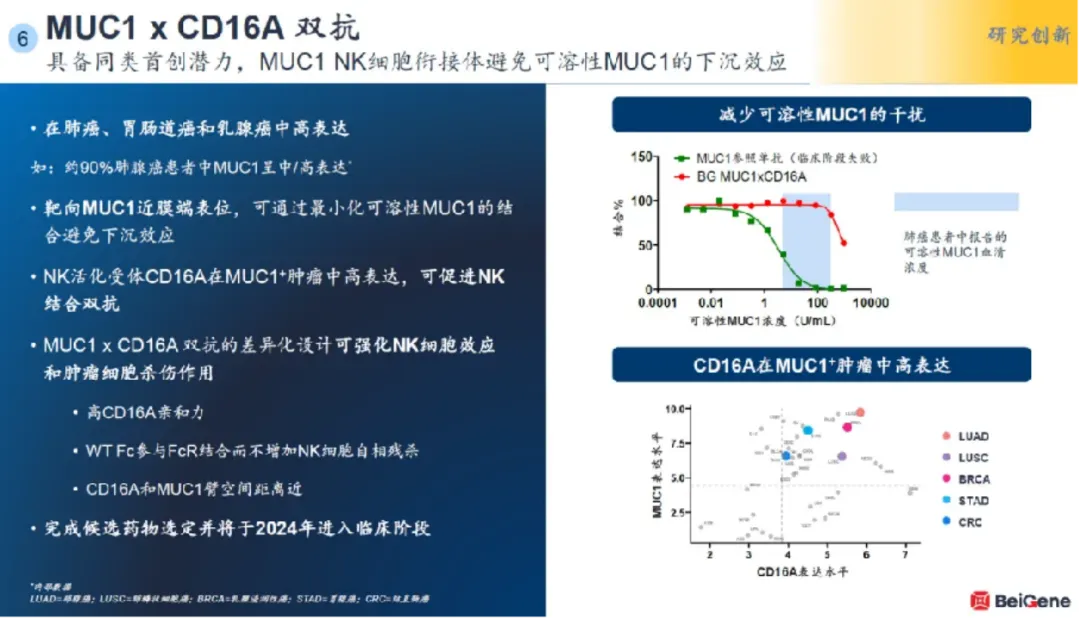 另一项比较有意思的双抗是BGB-B3227,它是TCE之后的下一代免疫细胞衔接抗体。其靶向MUC和CD16A两个靶点,关于MUC1这个靶点在关于第一三共的文章《ADC一哥,冲向新金矿》对该靶点进行了较为详尽的叙述。而CD16A是NK细胞上的受体,如上图所示,该双抗起的主要作用就是链接NK细胞和肿瘤细胞,而根据百济神州研发日PPT中的叙述,NK活化受体CD16A在MUC1+的肿瘤中高表达,这也是选择这两个靶点进行组合的主要原因。