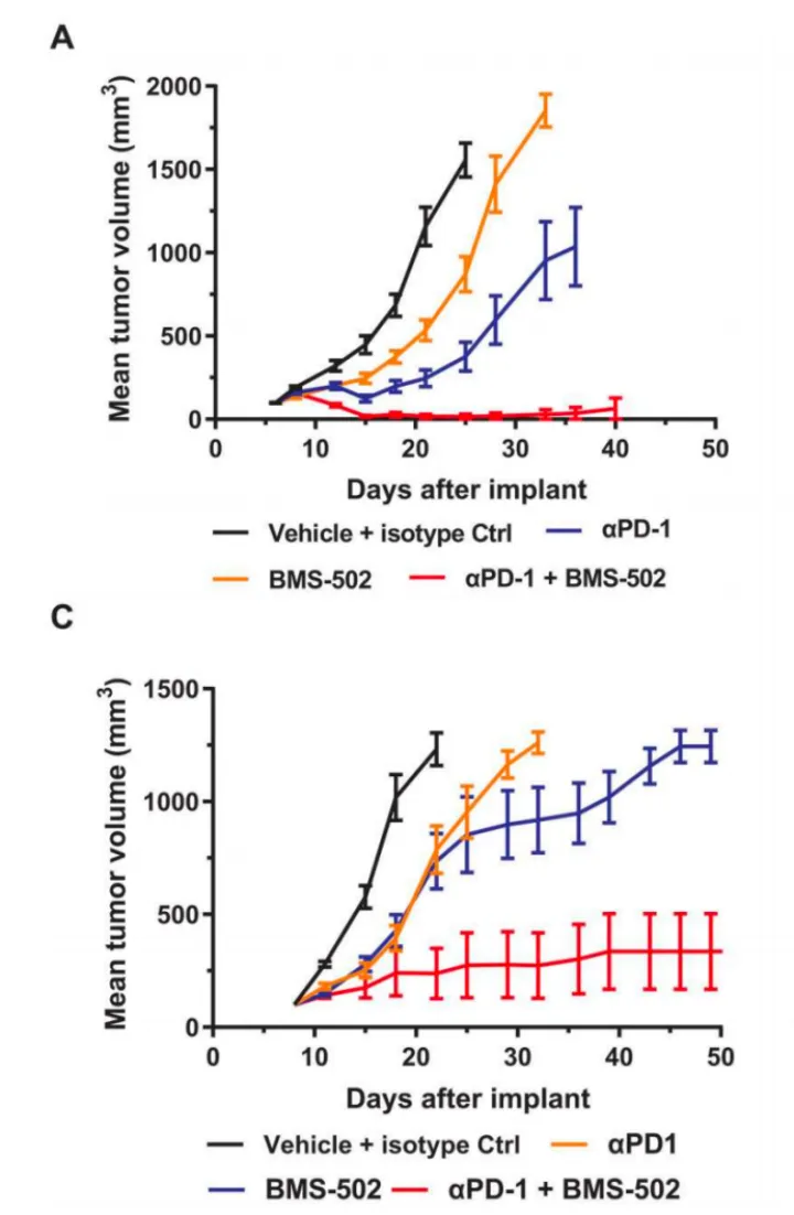 (图源同上,如图所示,αPD-1单抗和BMS-502与联用,使得肿瘤体积减小的幅度比两药分别单独使用是更加有效的。图A:MC38 tumor