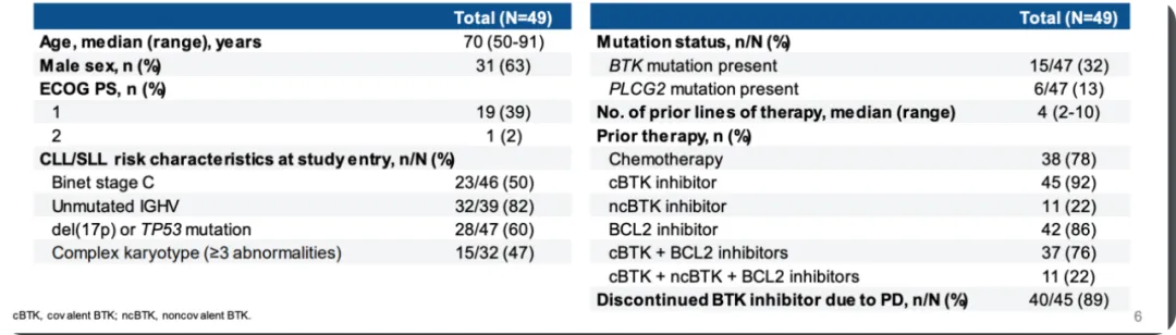 患者基线如图所示,此前的中位治疗线数为4,92%的患者经历了不可逆共价抑制剂(cBTK)治疗,22%患者经历了可逆非共价抑制剂(ncBTK)治疗(目前FDA仅批准一款药物),86%经历了Bcl2抑制剂治疗。32%患者有BTK突变。