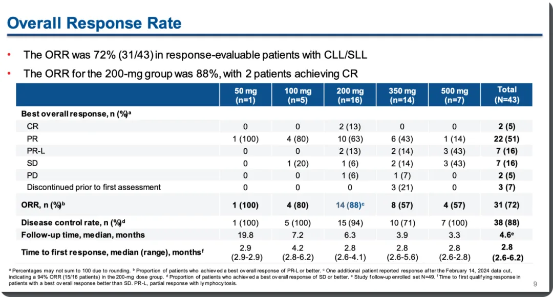剂量爬坡上,分为50mg,100mg,200mg,350mg,500mg剂量组。最终结果如图所示,总体ORR达到了72%,最佳剂量为200mg,人数也最多(统计学意义更显著),ORR达到了88%。此外,在此前接受了cBTKi治疗的患者中,ORR也达到了70%,在此前Del(17p)